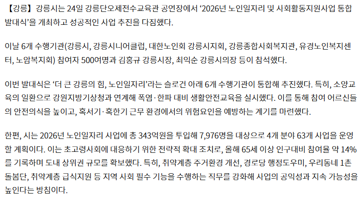 강릉시, 노인일자리 사업 343억 투입…7천976명 대상