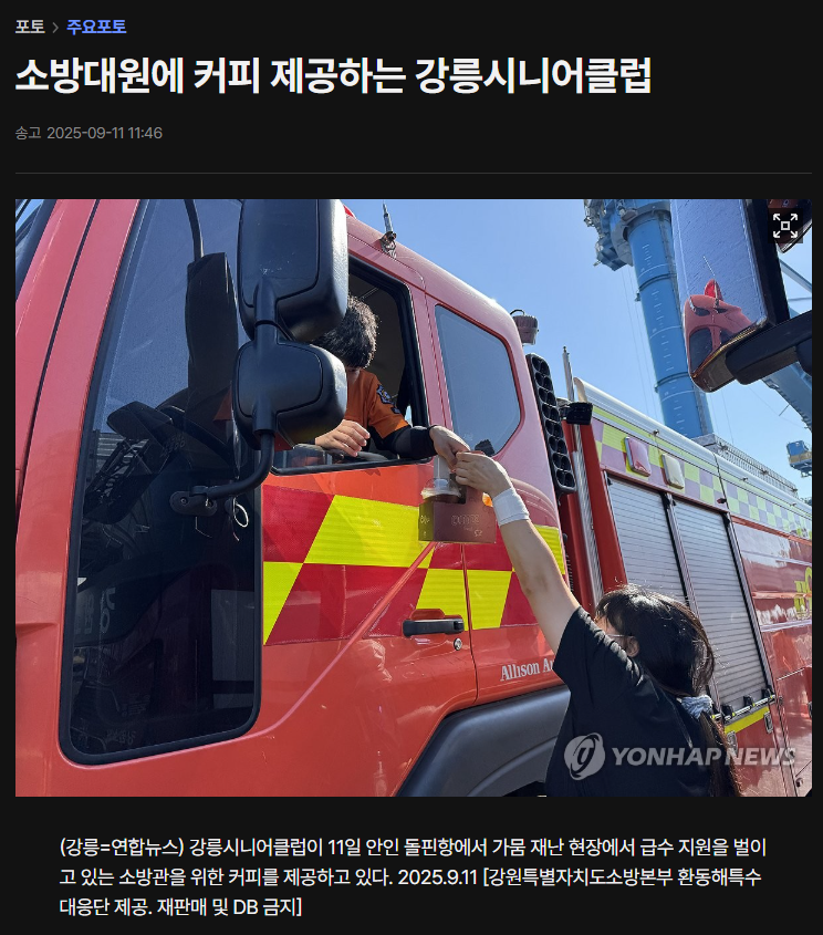 소방대원에 커피 제공하는 강릉시니어클럽