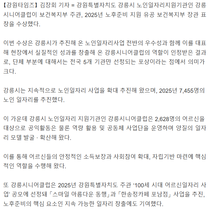 노인일자리지원기관 강릉시니어클럽, 보건복지부장관 표창